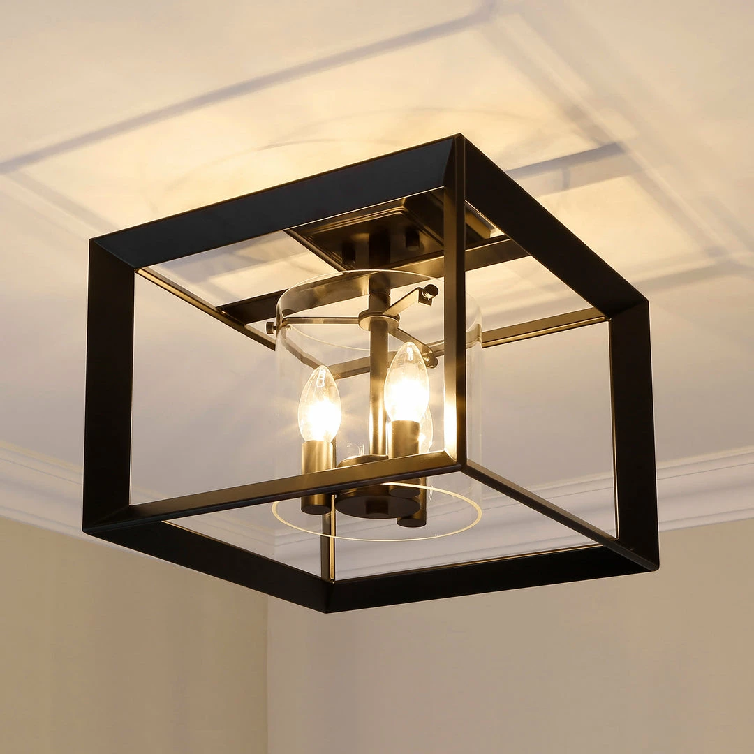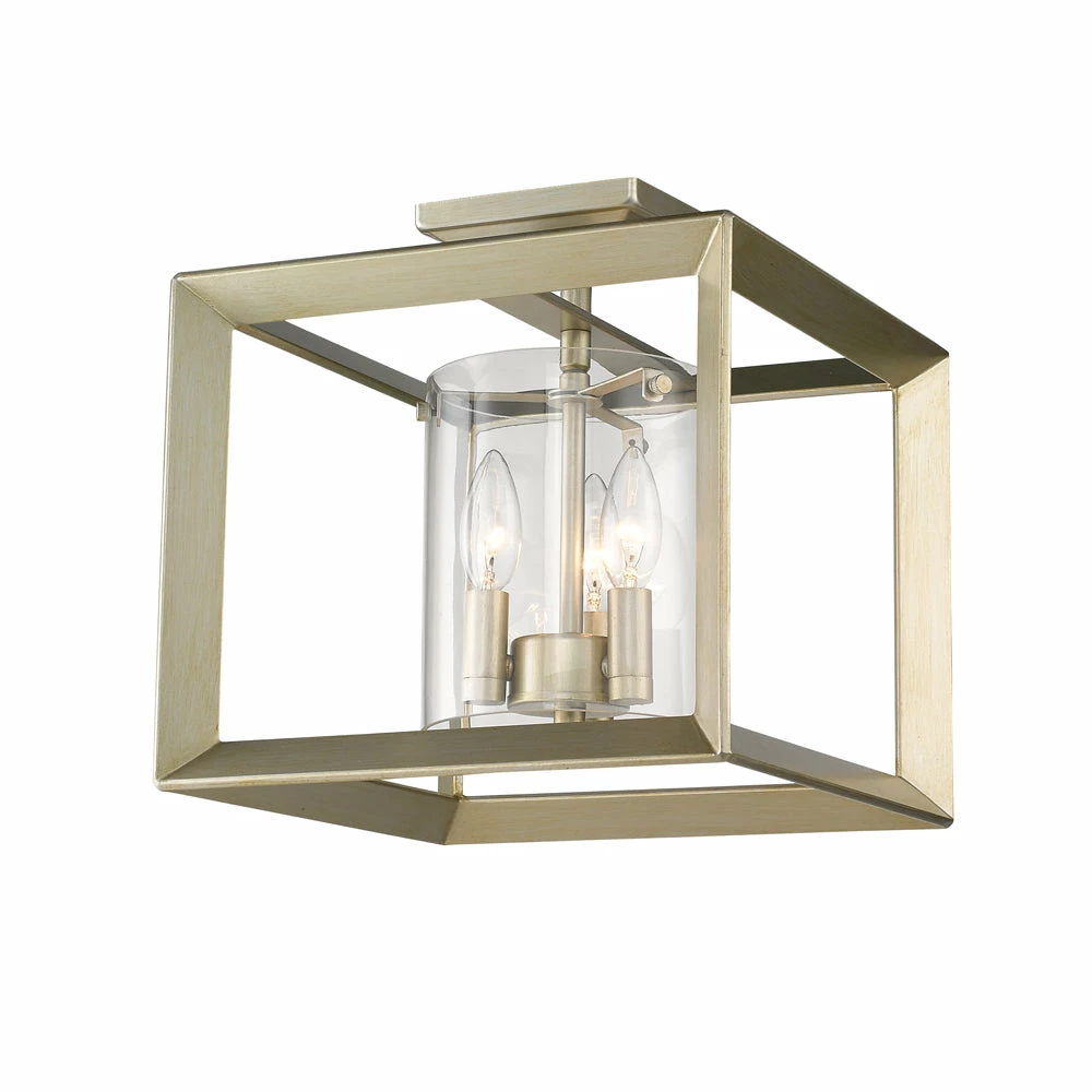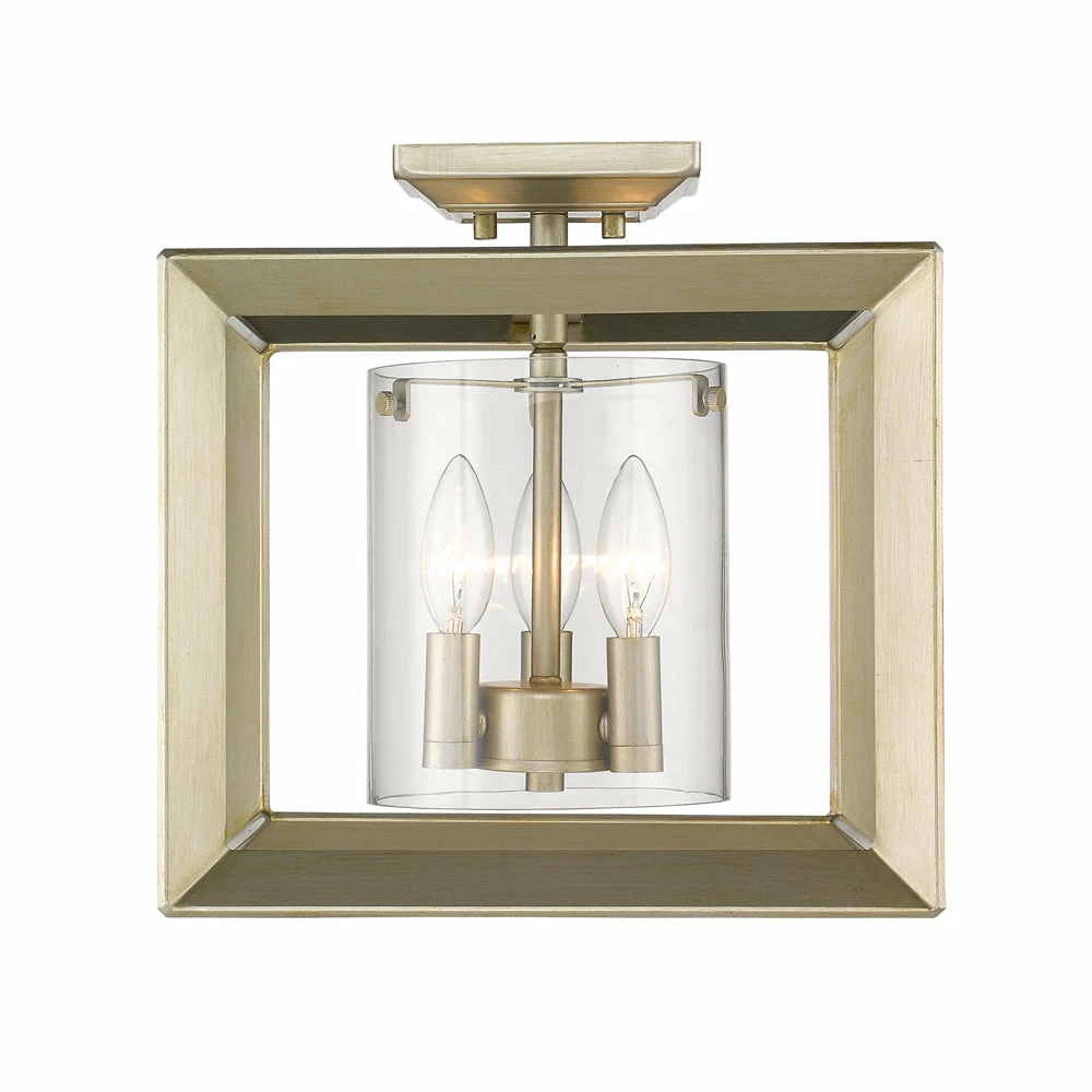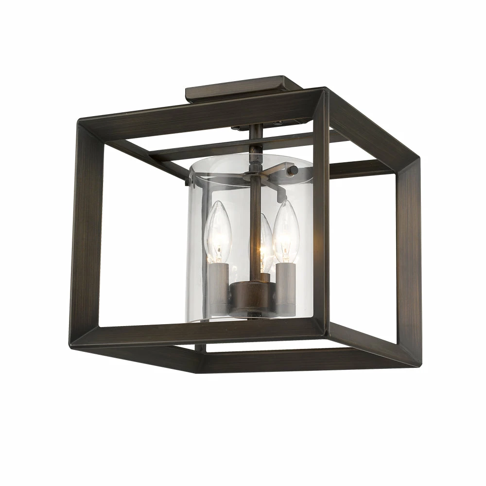 Modern lanterns featuring a handsome beveled cage design. Make an elegant statement in the Smyth collection. Clean geometry creates contemporary style with steel candles and candelabra bulbs encased in select glass options. The fixtures are offered in a variety of finishes. This 3-light Low Profile semi-flush creates a stylish focal point.