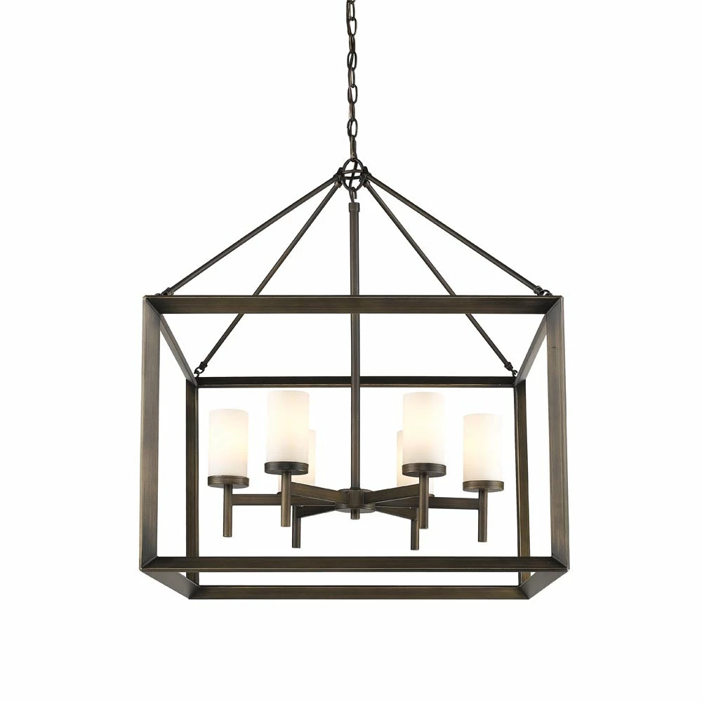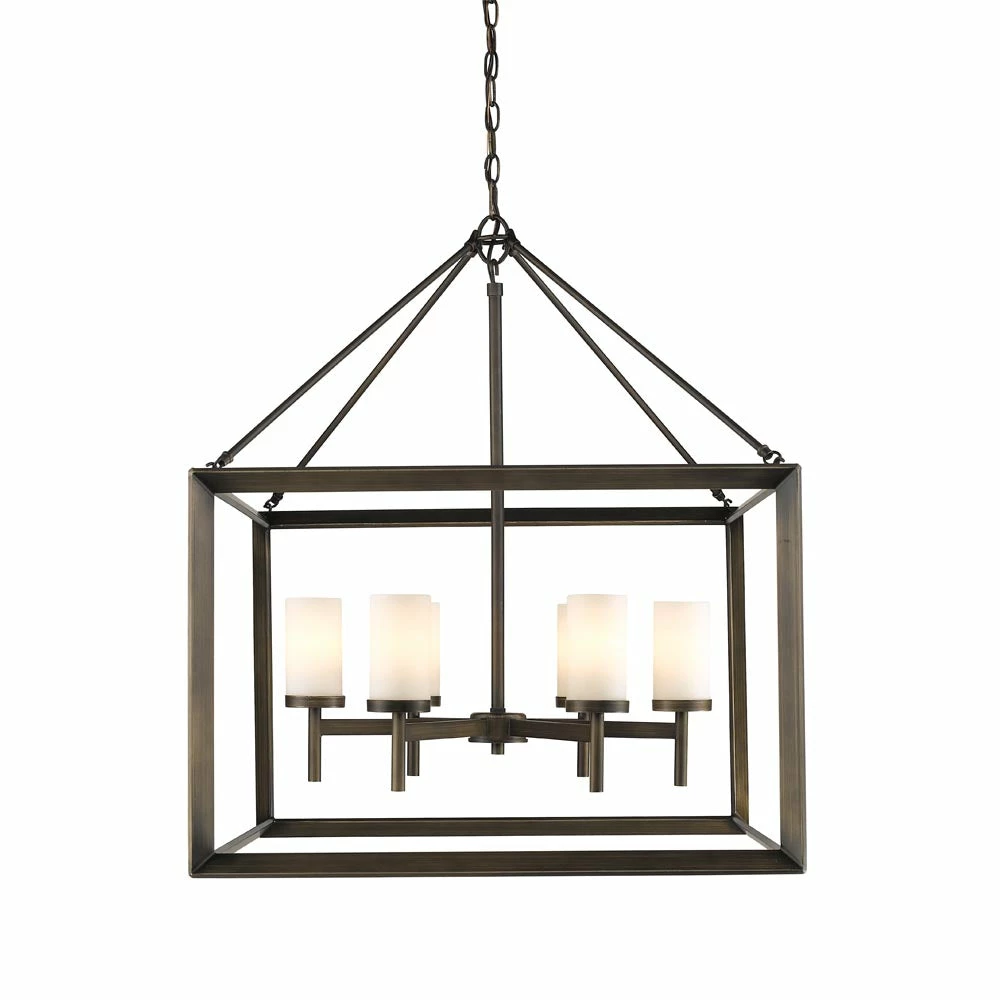 Modern lanterns featuring a handsome beveled cage design. Make an elegant statement in the Smyth collection. Clean geometry creates contemporary style with steel candles and candelabra bulbs encased in select glass options. The fixtures are offered in a variety of finishes. This 6-light chandelier creates a stylish focal point and warm ambient lighting perfect for intimate living and dining areas or task lighting.