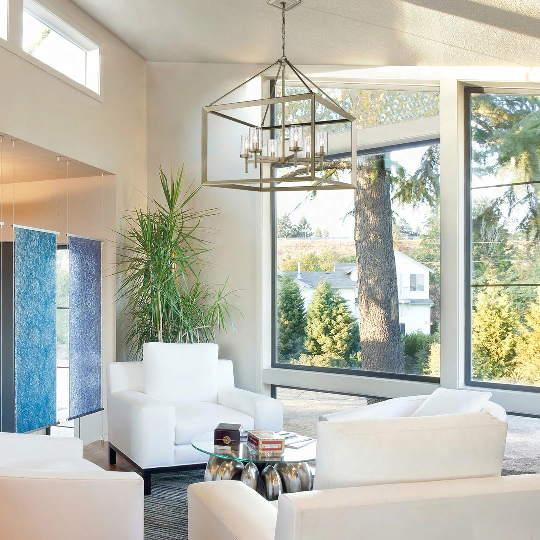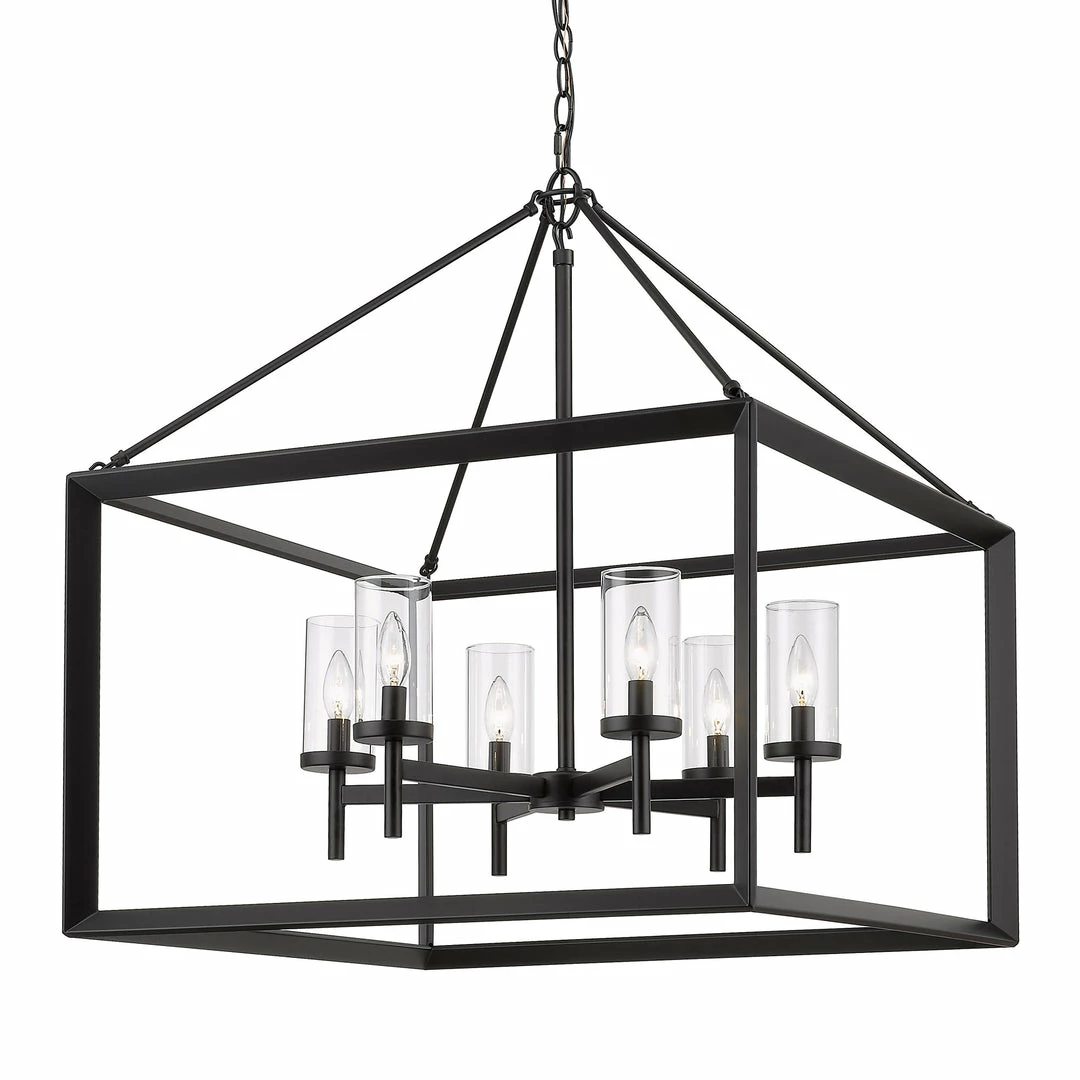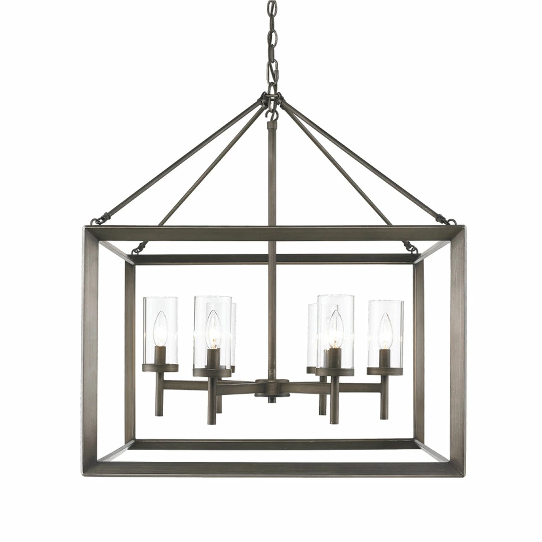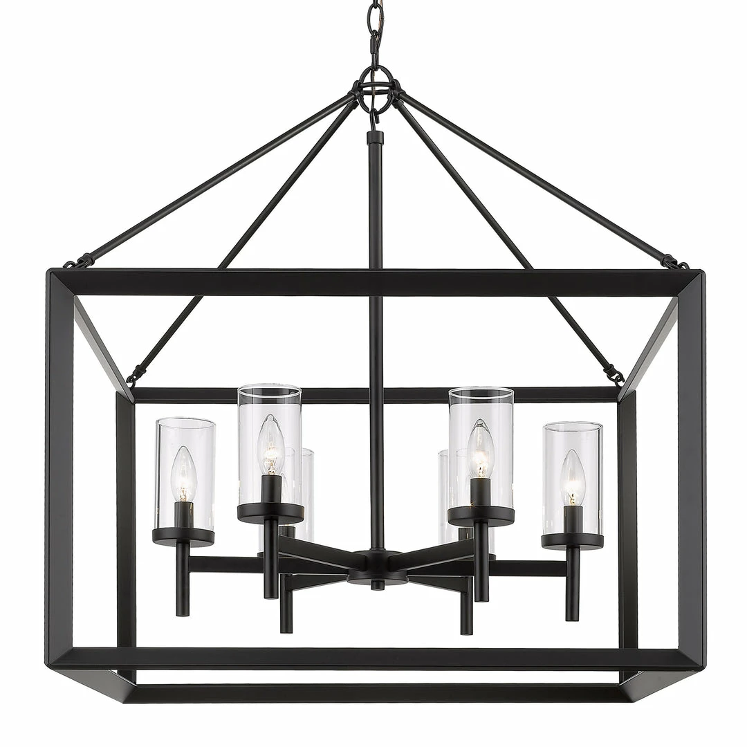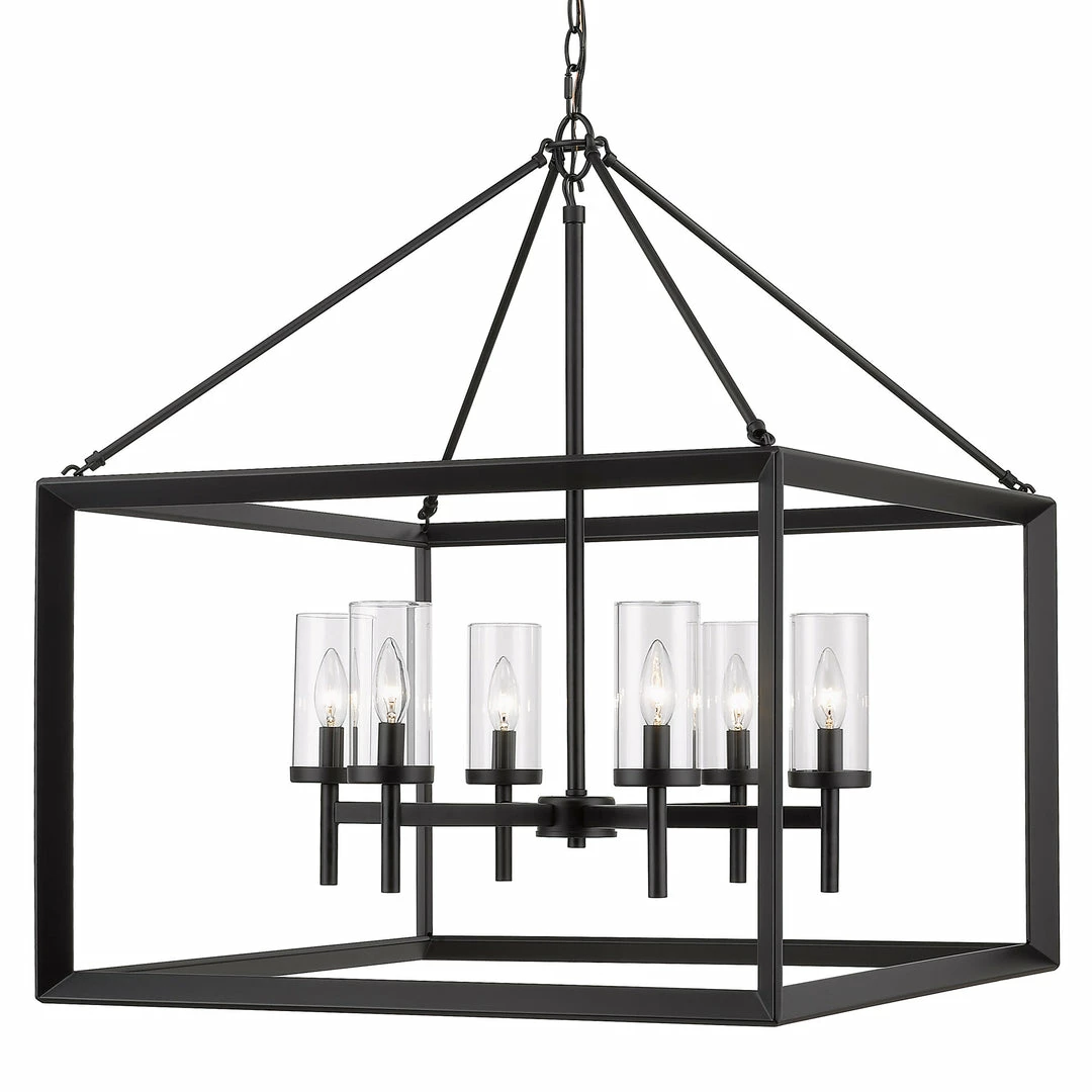 Modern lanterns featuring a handsome beveled cage design. Make an elegant statement in the Smyth collection. Clean geometry creates contemporary style with steel candles and candelabra bulbs encased in select glass options. The fixtures are offered in a variety of finishes. This 6-light chandelier creates a stylish focal point and warm ambient lighting perfect for intimate living and dining areas or task lighting.