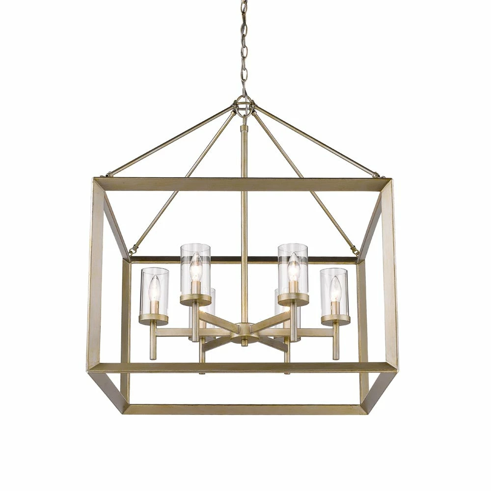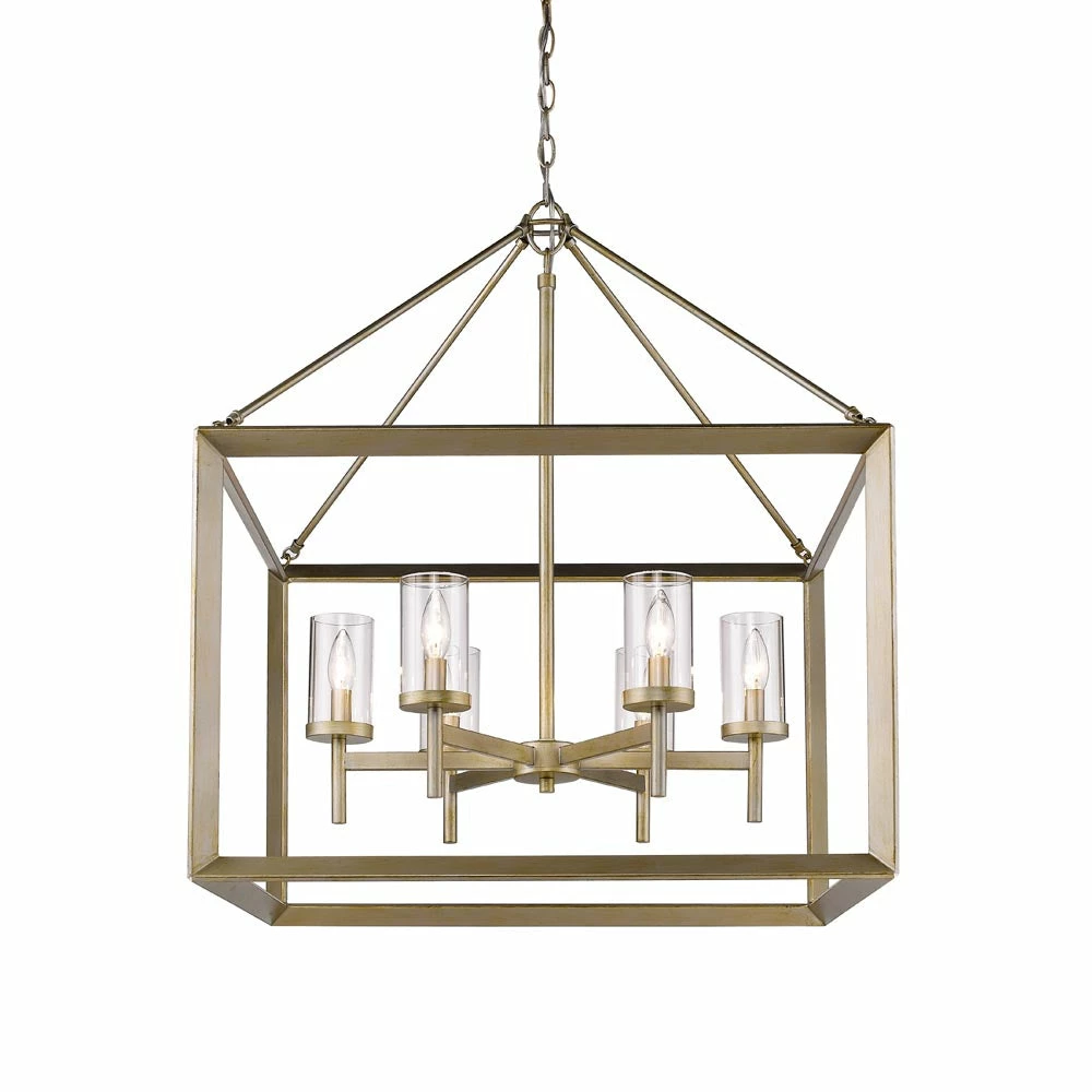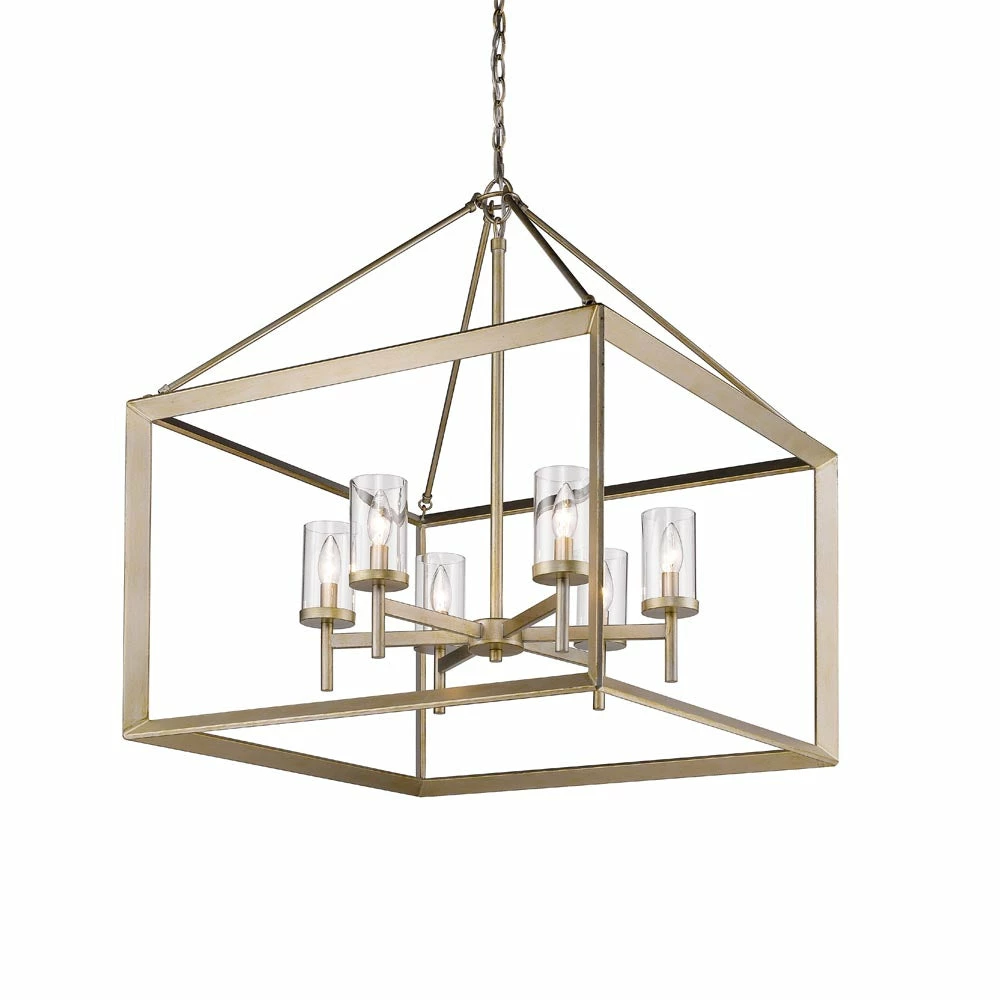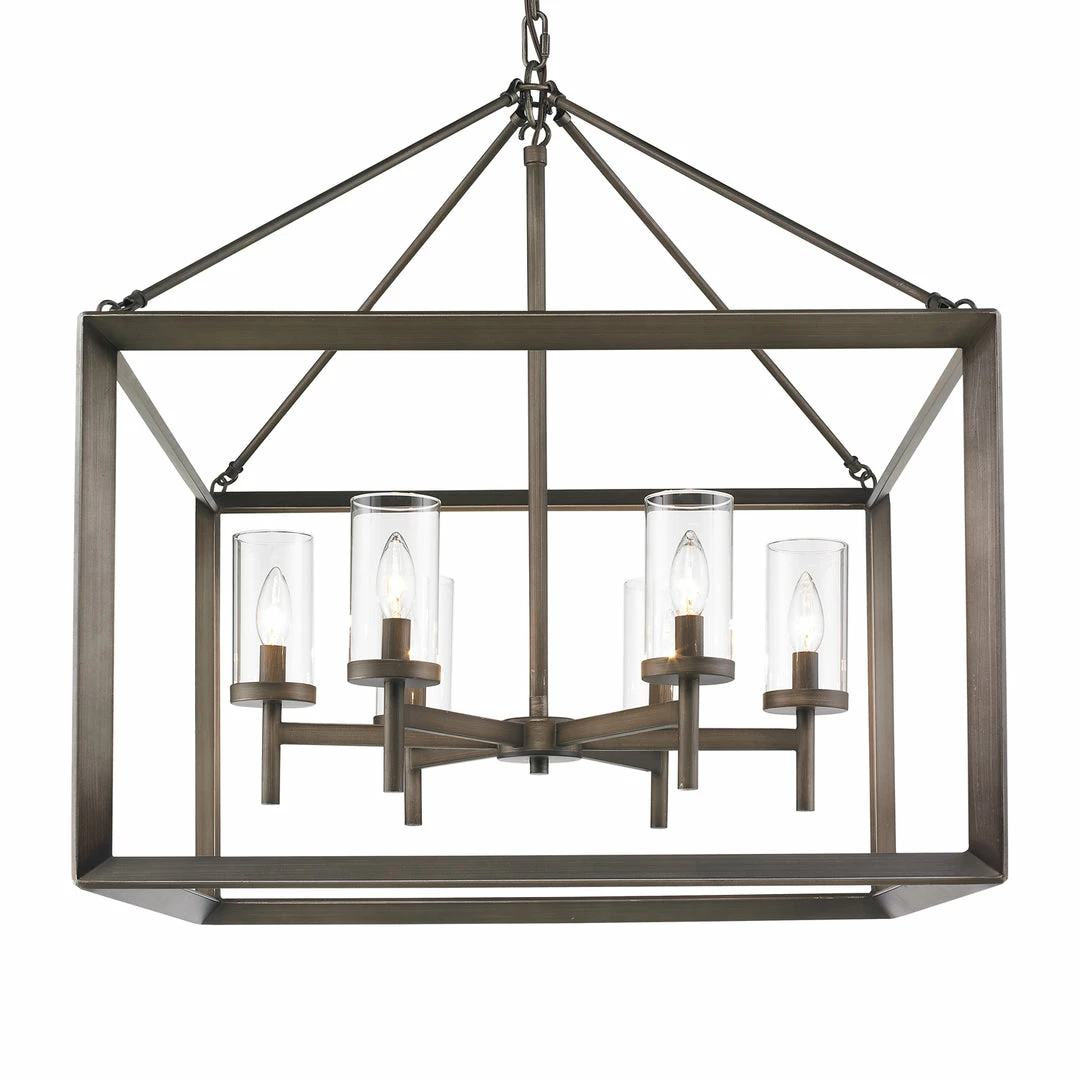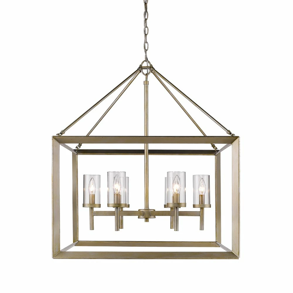 Modern lanterns featuring a handsome beveled cage design. Make an elegant statement in the Smyth collection. Clean geometry creates contemporary style with steel candles and candelabra bulbs encased in select glass options. The fixtures are offered in a variety of finishes. This 6-light chandelier creates a stylish focal point and warm ambient lighting perfect for intimate living and dining areas or task lighting.