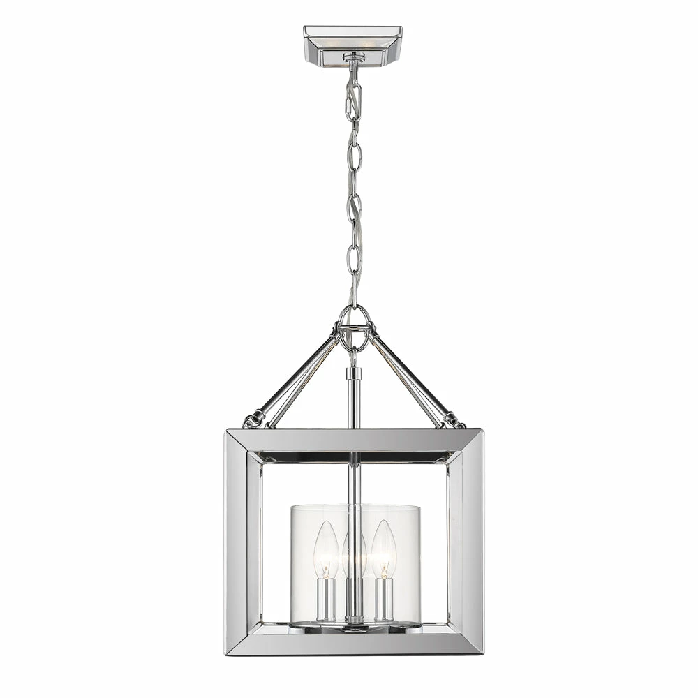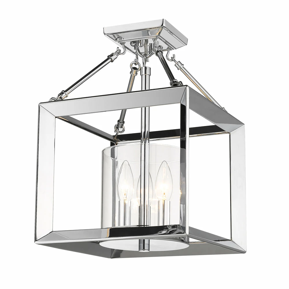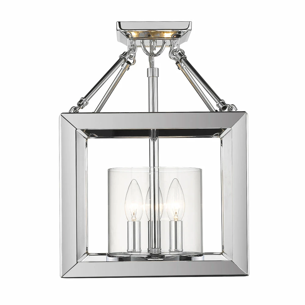 Modern lanterns featuring a handsome beveled cage design. Make an elegant statement in the Smyth collection. Clean geometry creates contemporary style with steel candles and candelabra bulbs encased in select glass options. The fixtures are offered in a variety of finishes. This 3-light convertible semi-flush creates a stylish focal point that can be mounted as a flush mount or hung as a pendant.
