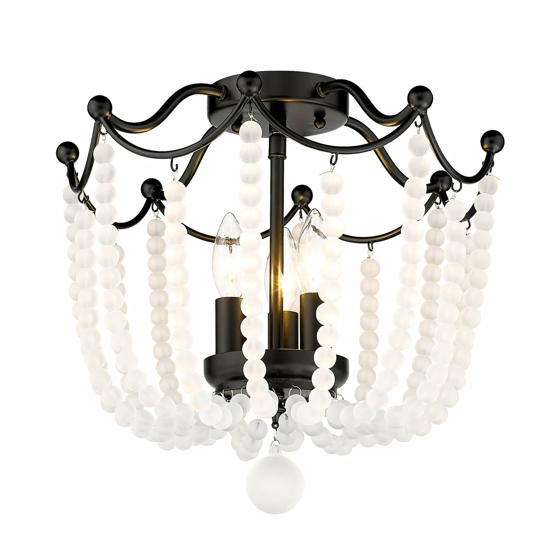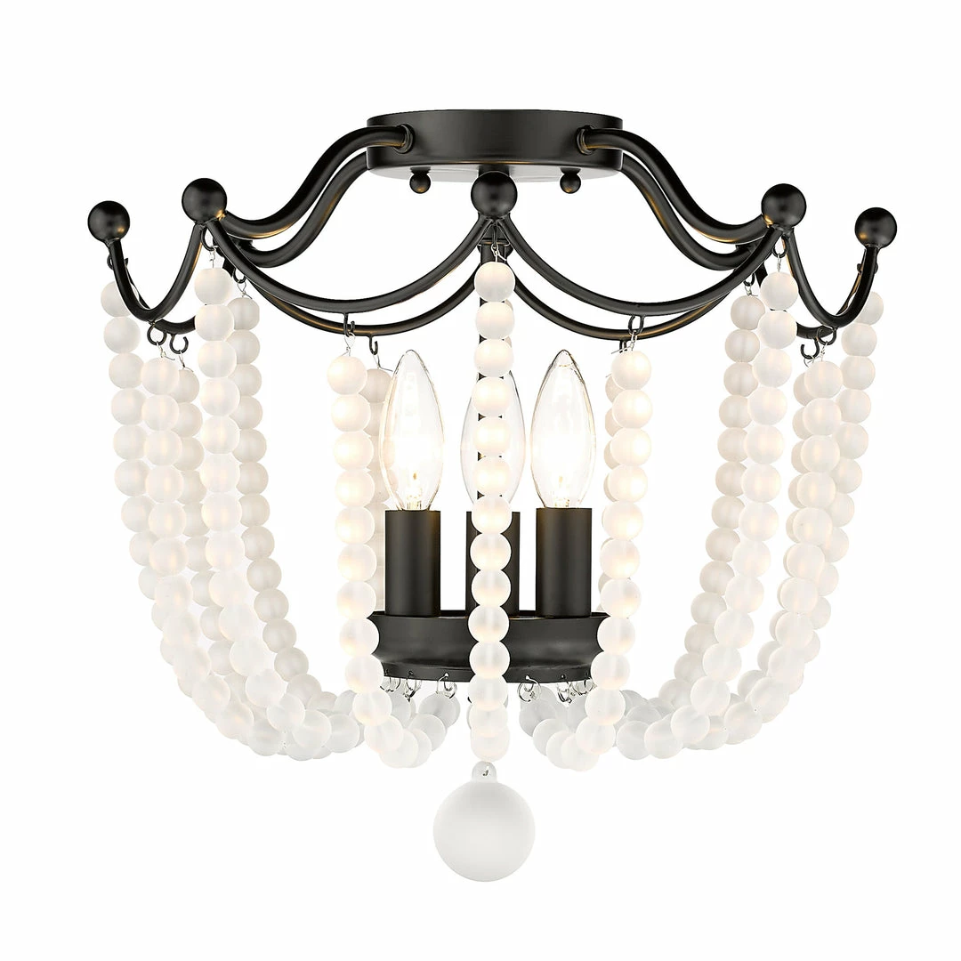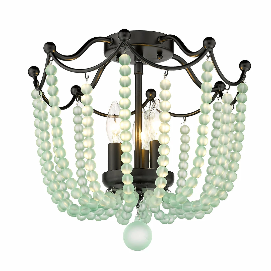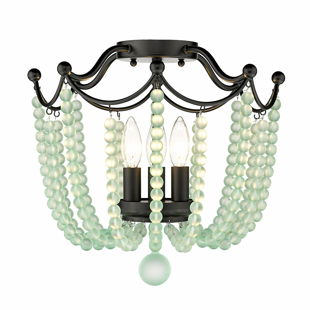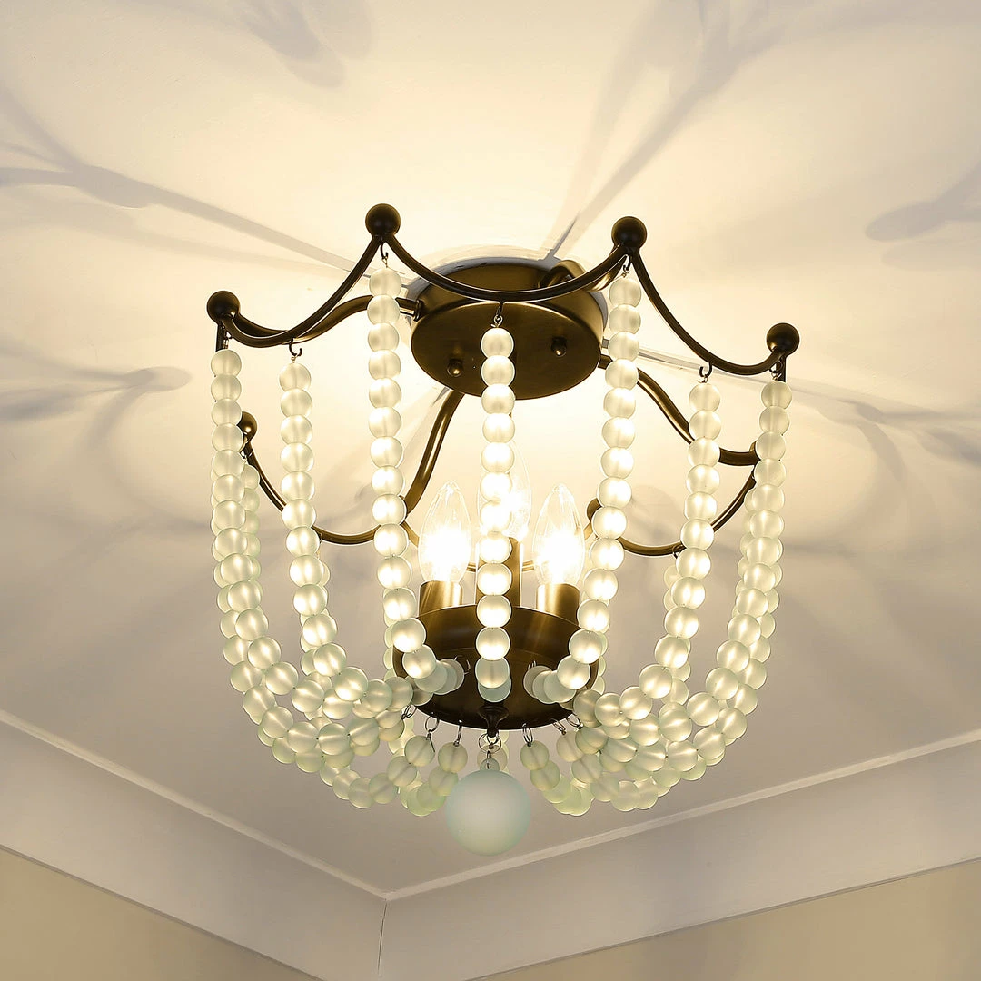 Billowing like a ballgown, the regal stature of Tiara is second to none. Strands of vibrant crystal beads sweep outward and upward to gather along the dainty frame. Offered in multiple colors, these beautiful crystal accents are cut to maximize light refraction. Exposed candelabras peek through the shade’s gleaming beads to offer widespread ambient light. Add a touch of romance to any space with the Tiara semi-flush.