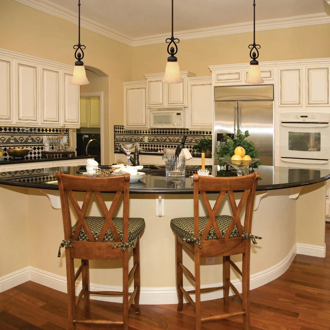Sophisticated and metropolitan with a nod to the classics, the Torbellino collection brings bold contrast and undeniable style to the room. Swirled columns and finials in a deep Cordoban Bronze finish embodies the rich tones of fine bronze sculptures. The unique Remolino Glass echoes those twists and turns adding texture and visual appeal even when the light is off. Ideal for the kitchen, the mini pendant provides soft ambient downlight, illuminating a kitchen bar or countertop without interfering with activity on the surface.