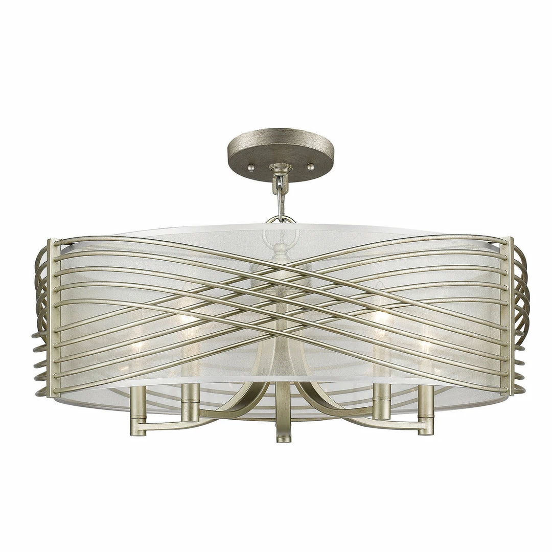 Zara is a fashionable, transitional style. Thin bands of steel in select finishes flow boldly around a fabric shade in a unique, cross-woven design. The bold rectangular arms are echoed by the rectangular supports of the overlapping metal. This strong geometry is softened by a number of shade options. This 5-light chandelier creates a stylish focal point. Its height is perfectly sized for 8 or 9 feet ceilings.
