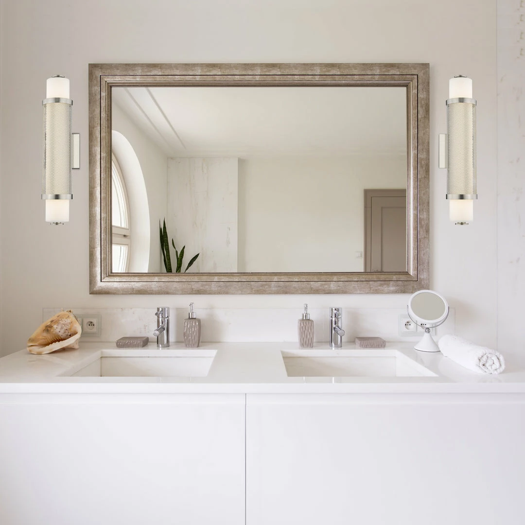 Clean, modern and sophisticated, Turner is a series of dimmable, energy-efficient LED bath bars. Mesh metal in a matte pewter finish wraps the opal glass for an edgy, contemporary look. Fixtures feature an adjustable back plate that allows horizontal and vertical install. Remove the coverplate for a sleeker install. The bright lights are perfect over or next to a mirror.