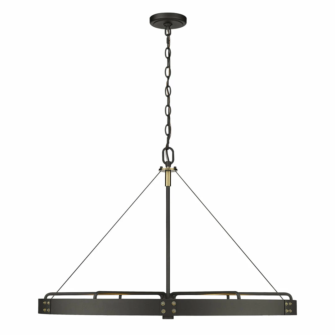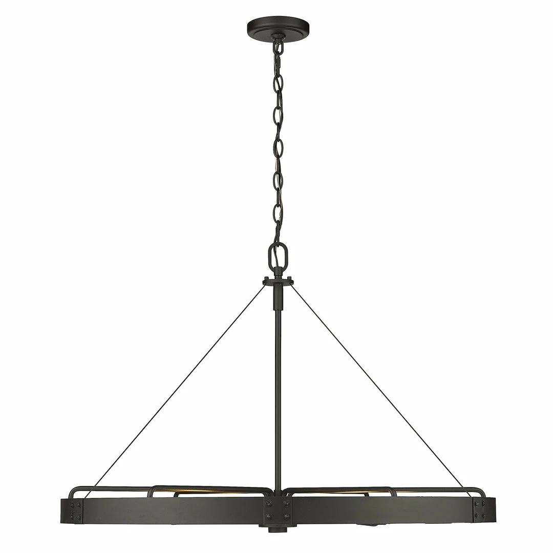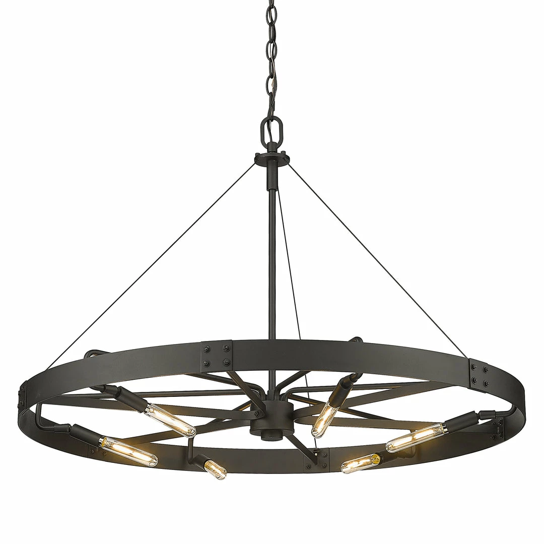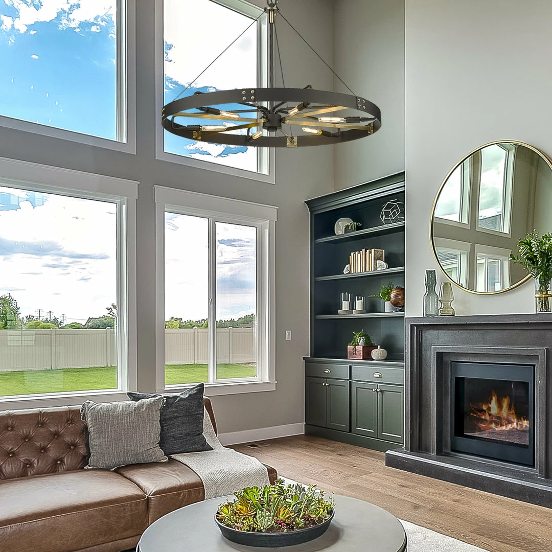 Industrial by nature, Vaughn fits well in contemporary homes. Inspired by the spokes of a vintage wagon wheel, this collection brings antiquity to the modern age. The Natural Black finish is slightly textured and adds drama to this focal series. Select a monochromatic version or elevate the look by selecting a fixture with contrasting aged brass accents. Pivoting sockets and steel cables act as additional features to the bold design.