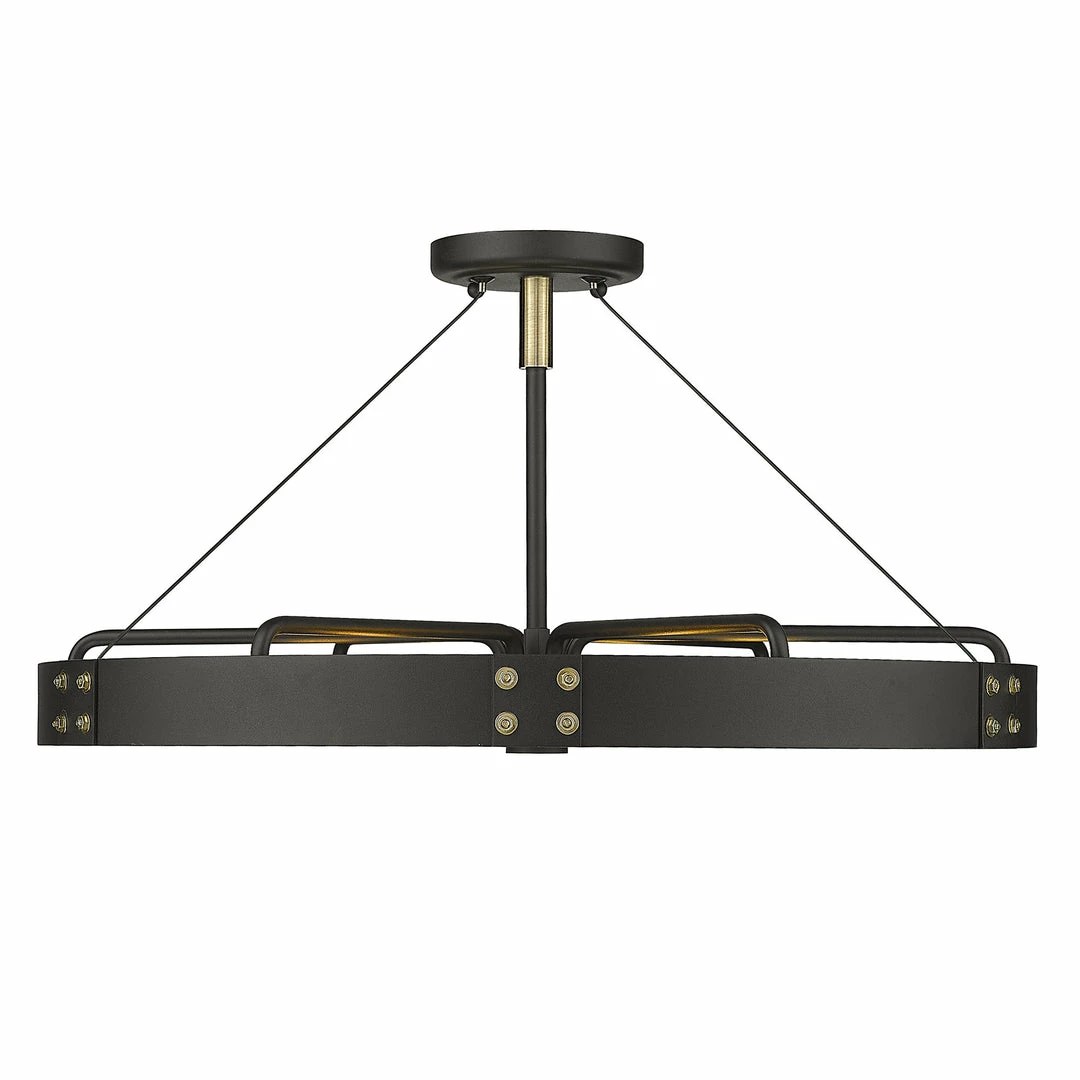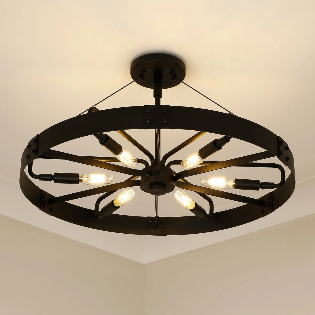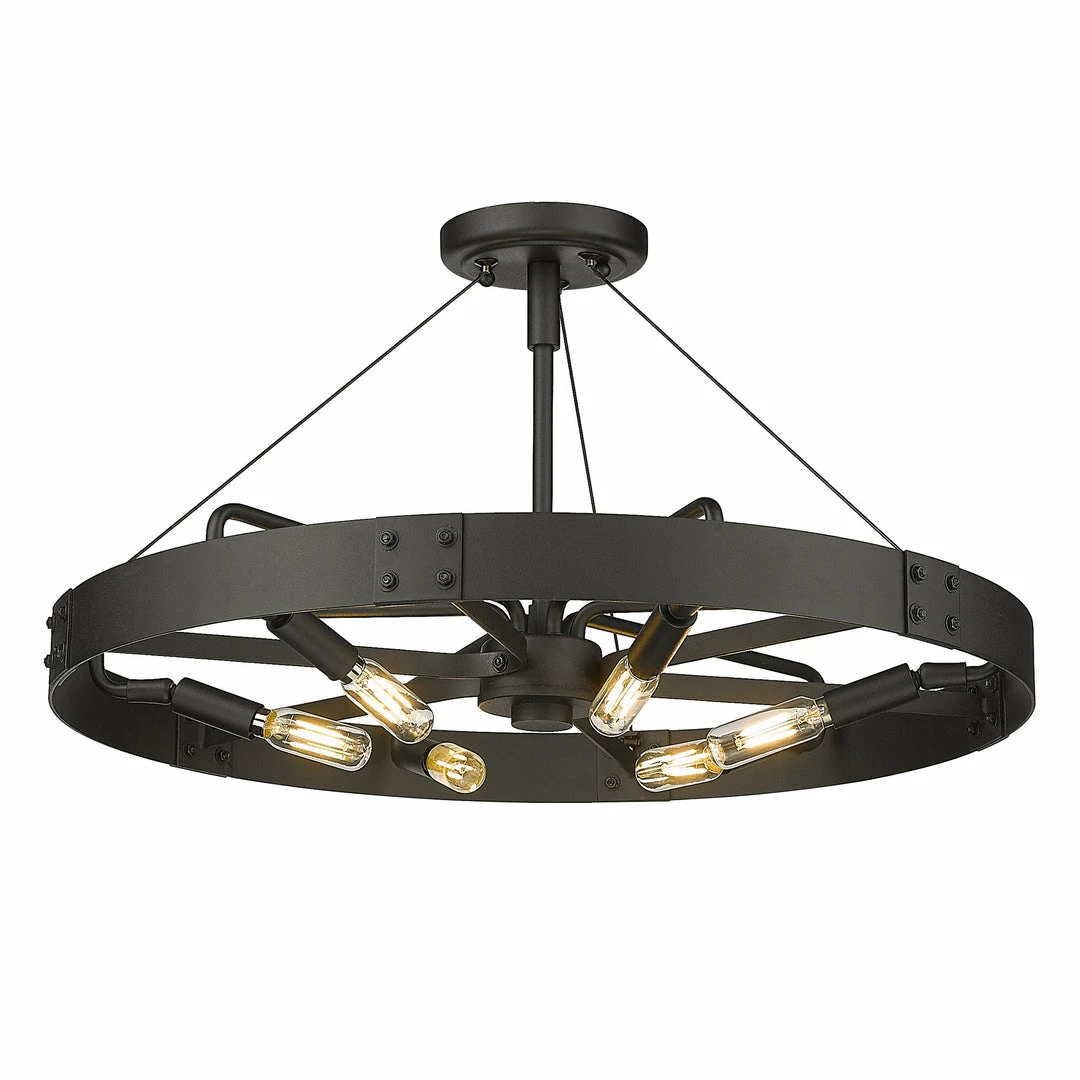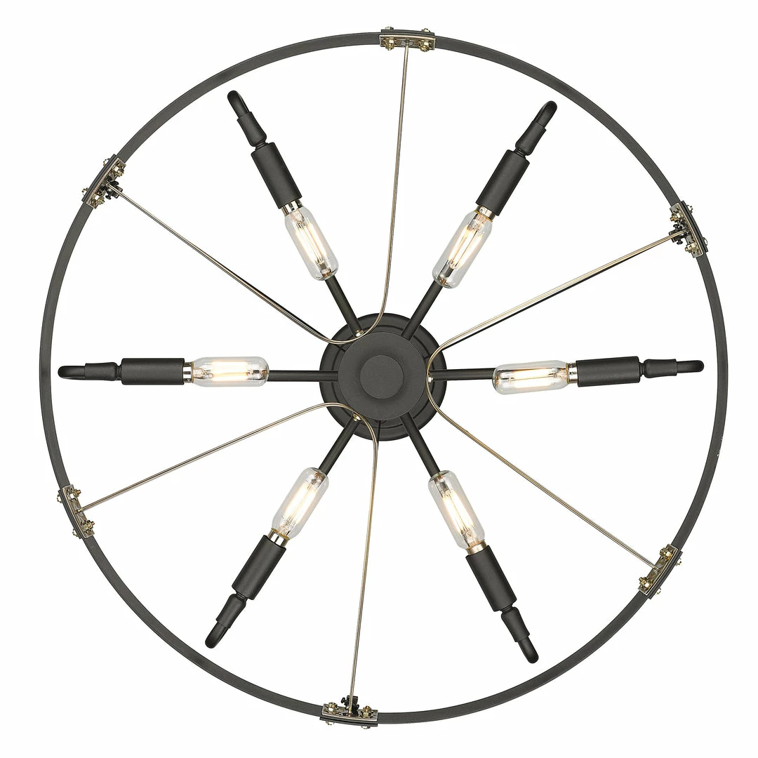 Industrial by nature, Vaughn fits well in contemporary homes. Inspired by the spokes of a vintage wagon wheel, this collection brings antiquity to the modern age. The Natural Black finish is slightly textured and adds drama to this focal series. Select a monochromatic version or elevate the look by selecting a fixture with contrasting aged brass accents. Pivoting sockets and steel cables act as additional features to the bold design.