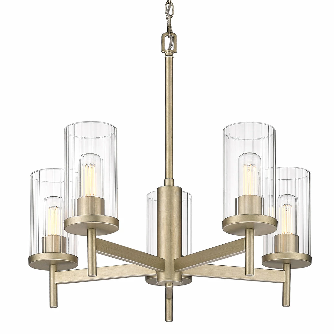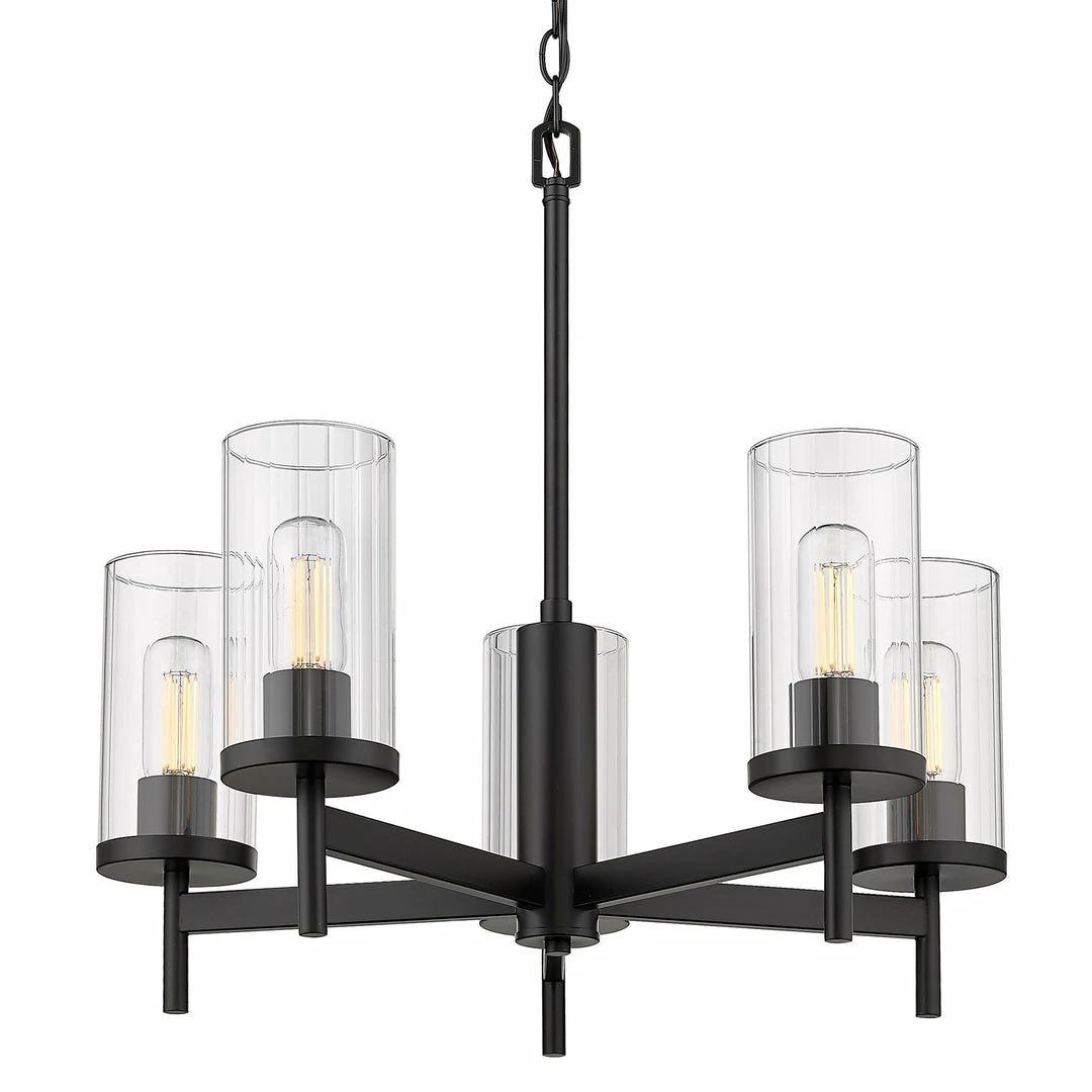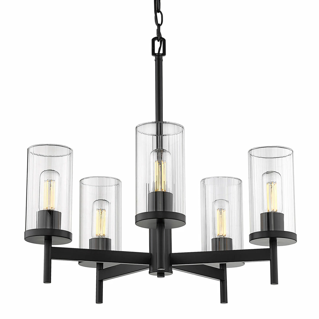 The Winslett collection is versatile and transitional in style. Classic silhouettes are perfectly matched with clean, modern lines for a mixture of form and function. Bright bulbs shine within ribbed clear glass shades. The linear texture, made by a glass-blowing technique, creates the optical illusion of distortion. The vertical lines in the glass provide gentle diffusion while playfully refracting light. Offered in a selection highly adaptable finishes, the Winslett collection is suitable for a variety of decors. This 5-light chandelier creates a stylish focal point and is comfortably sized for intimate dining and living areas.