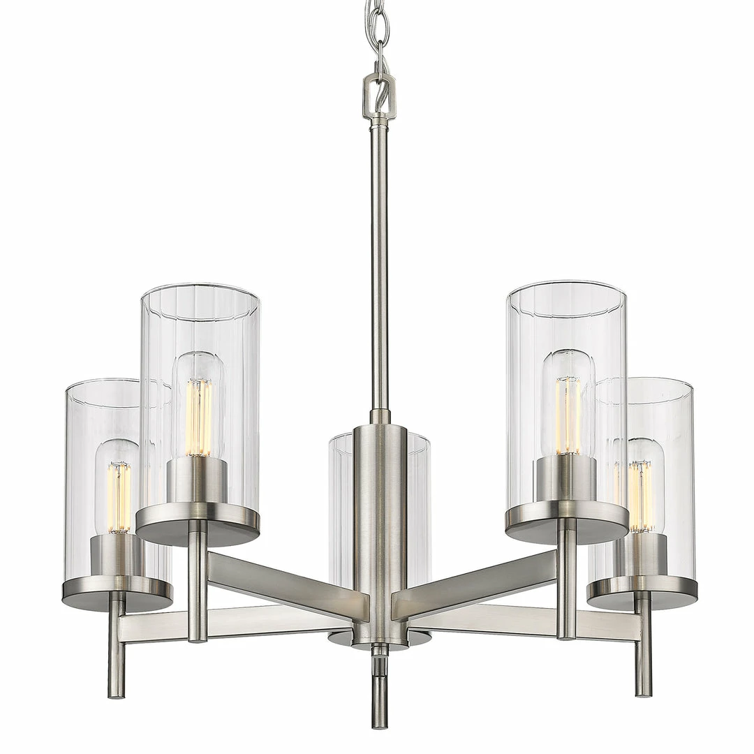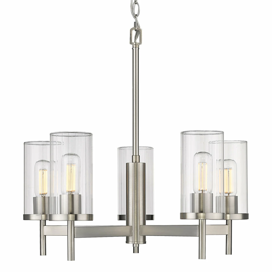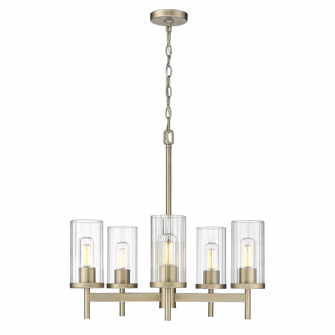 The Winslett collection is versatile and transitional in style. Classic silhouettes are perfectly matched with clean, modern lines for a mixture of form and function. Bright bulbs shine within ribbed clear glass shades. The linear texture, made by a glass-blowing technique, creates the optical illusion of distortion. The vertical lines in the glass provide gentle diffusion while playfully refracting light. Offered in a selection highly adaptable finishes, the Winslett collection is suitable for a variety of decors. This 5-light chandelier creates a stylish focal point and is comfortably sized for intimate dining and living areas.