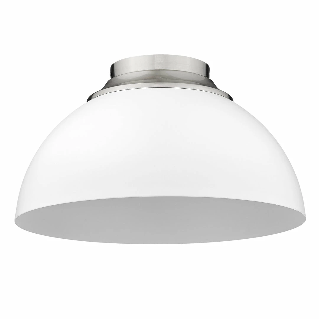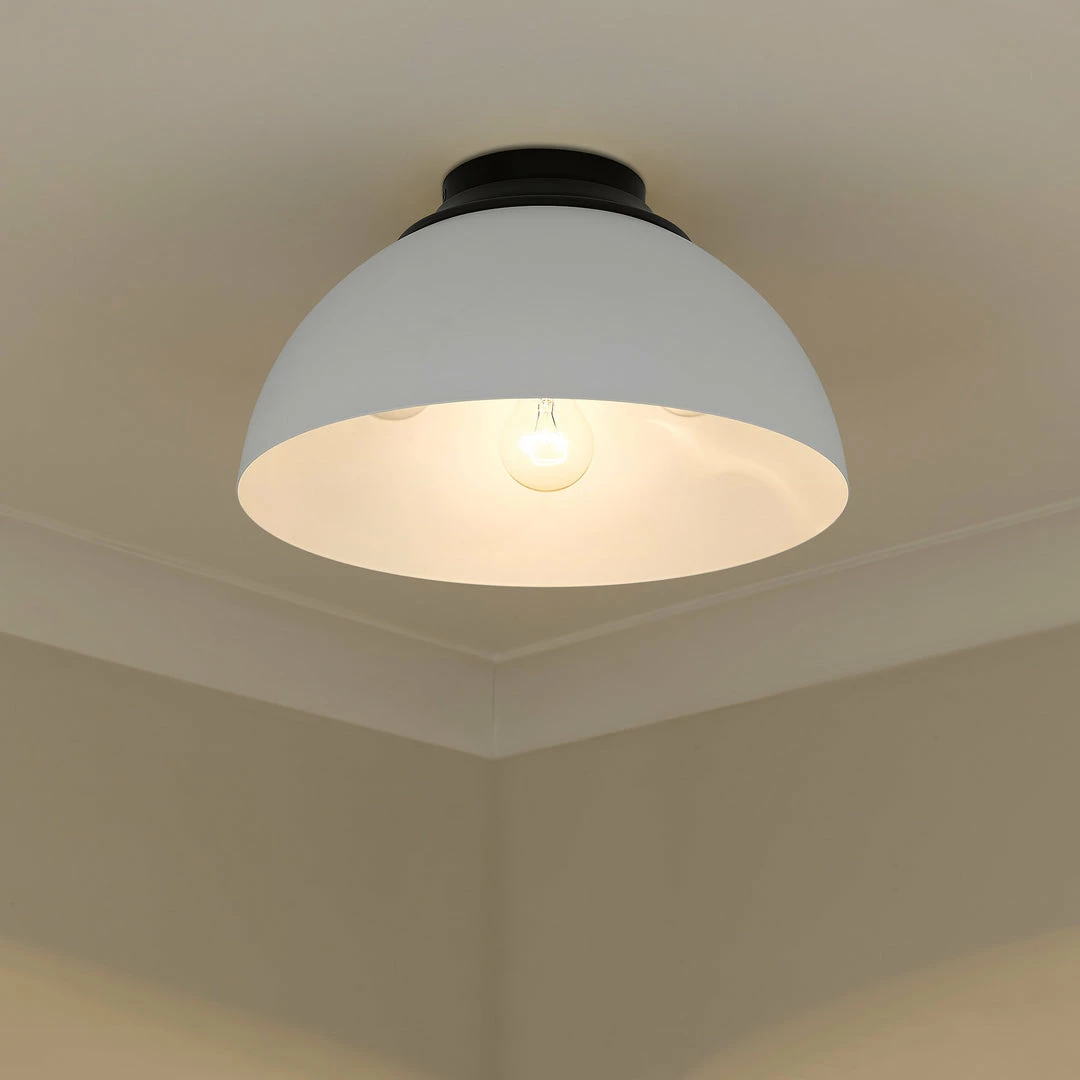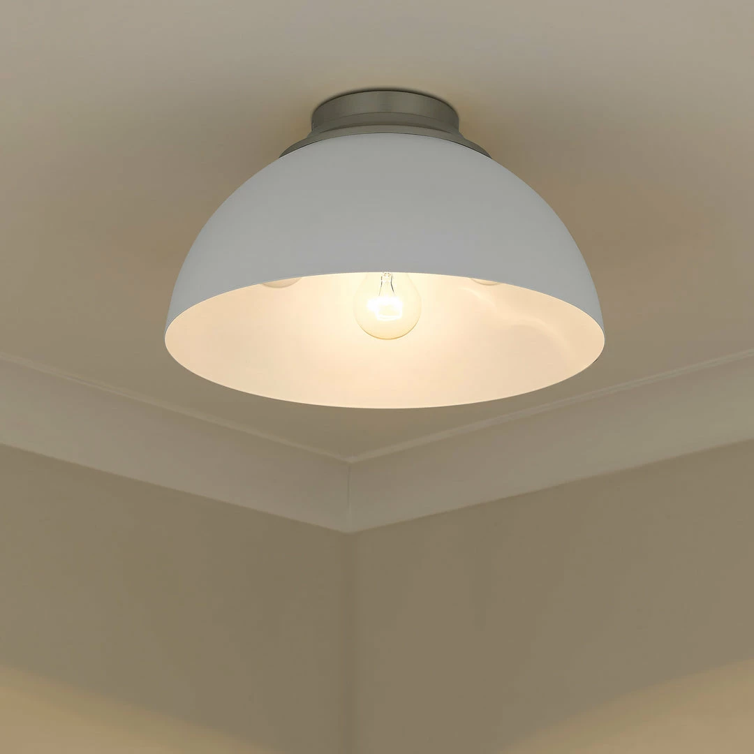 The Zoey Collection is proof that simple can be beautiful. This elegantly utilitarian series has the chic versatility to enhance the style of a variety of spaces. The smooth lines of this minimalist design pair well with transitional to modern dรฉcors. The cleanness of the contemporary look gives the fixtures a slightly industrial feel. Zoey is offered in a number of sizes with a combination of matte sheen shade and finish options available. The color of the shadeโs interior consistently matches the shadeโs exterior finish. The silhouette of the metal shade is a modern update to the classic dome shape. This Flush Mount is perfect for bathrooms, hallways, and kitchens.